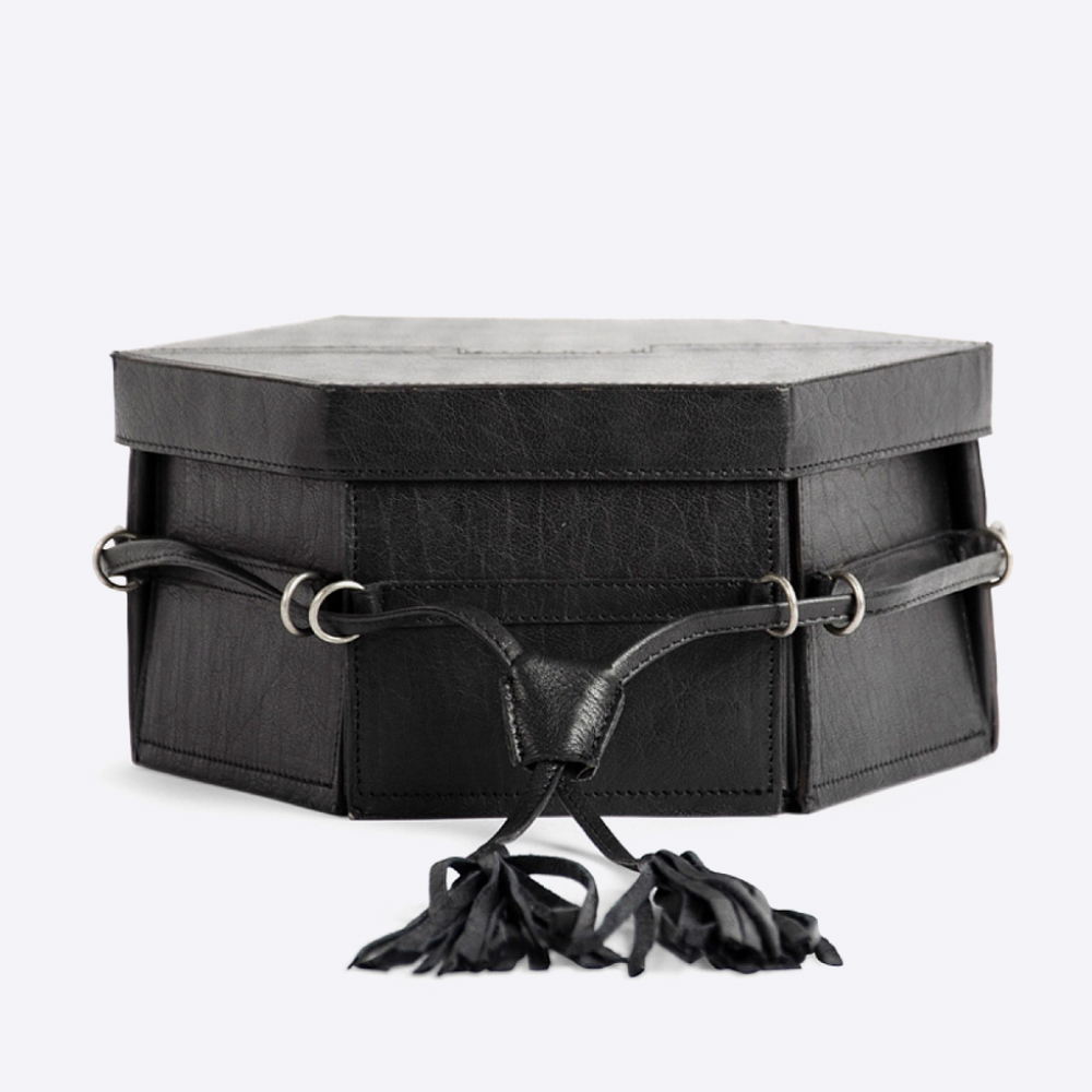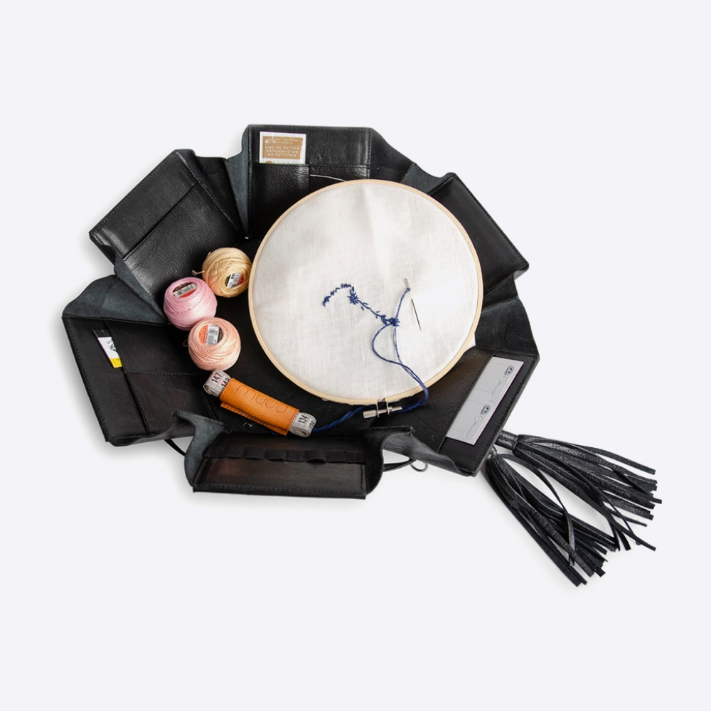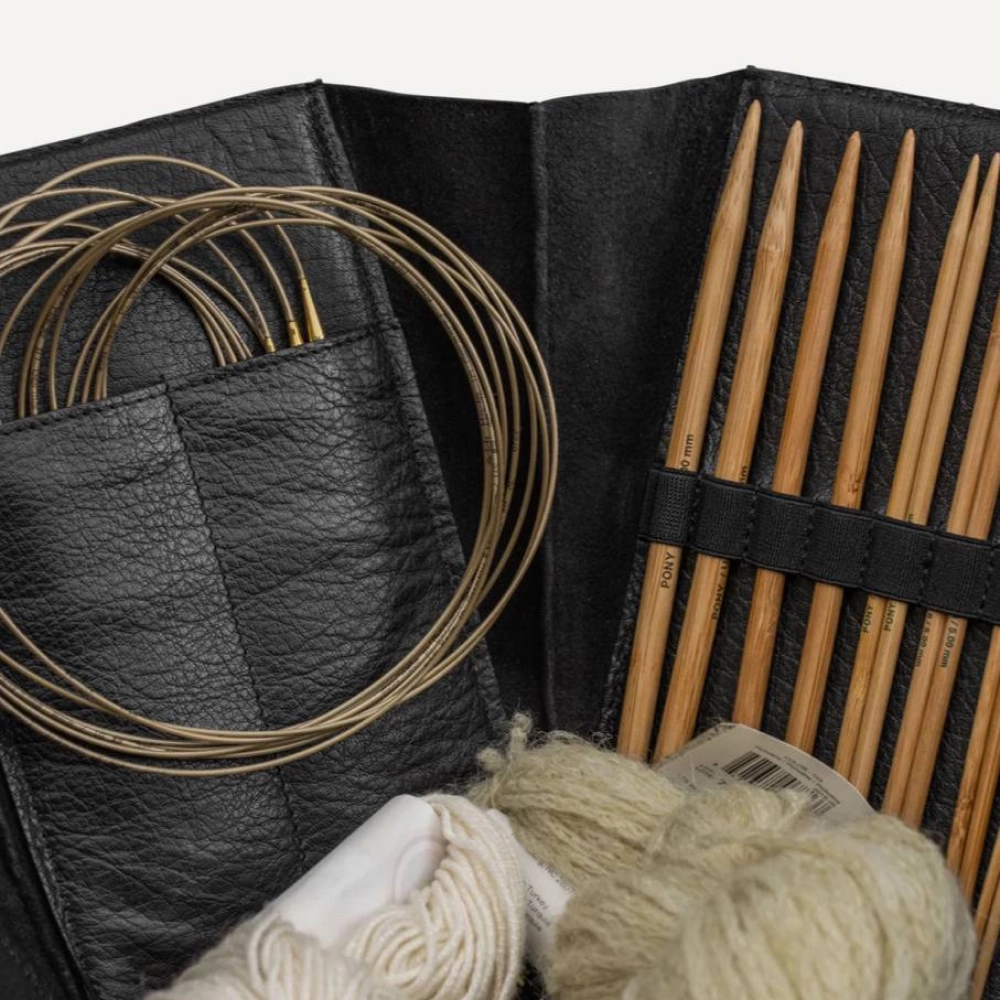 При ослаблении кожаного ремешка шестиугольная коробка разворачивается. Используйте практичные карманы, чтобы аккуратно хранить пряжу, спицы и аксессуары.