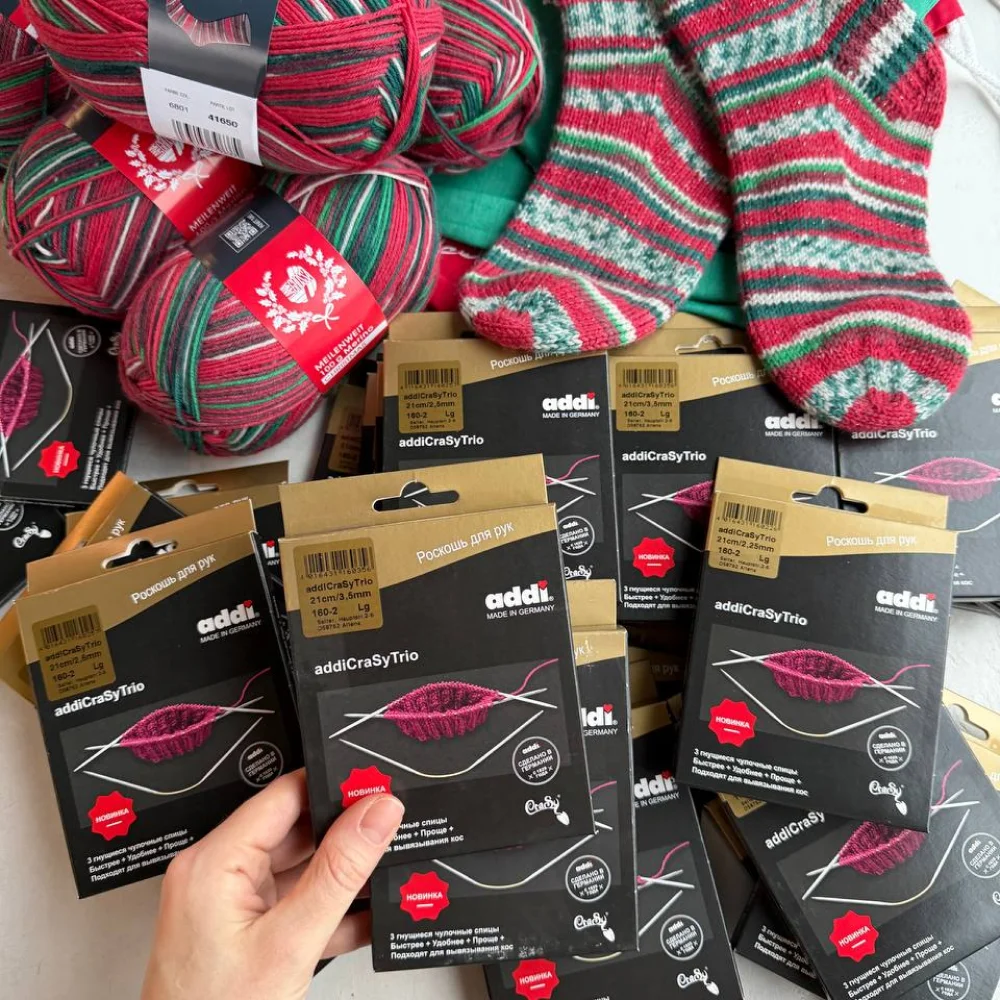 AddiCraSyTrio от Addi в сотрудничестве с Зильви Раш / КрейЗи настоящий Хит в мире вязальщиц и революция в круговом вязании короткими рядами! 3 гнущиеся чулочные спицы. Быстрее + Удобнее + Проще + Подходят для вывязывания кос.
