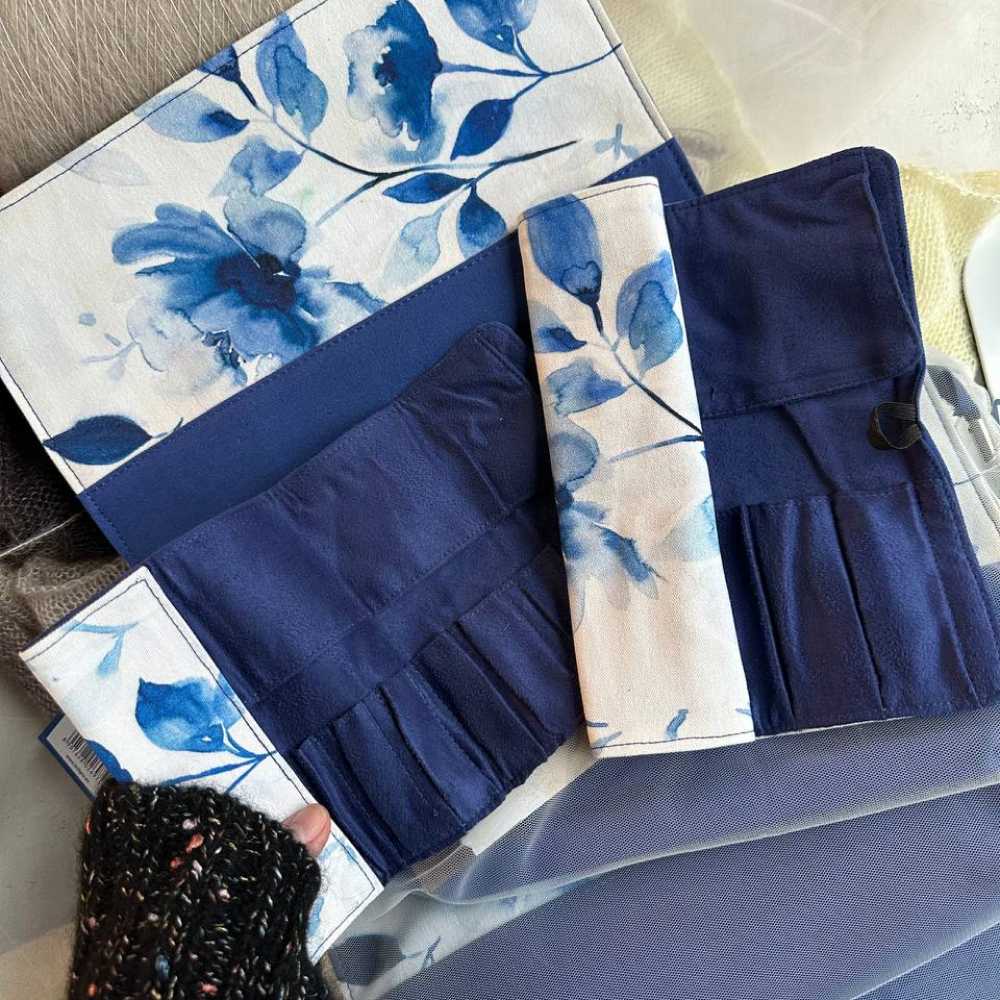 Отличный способ хранить съемные круговые спицы и лески, чулочные и круговые спицы. В дополнительные карманы поместятся все ваши вязальные гаджеты: маркеры, рулетка, ножницы. Супер для путешествующей вязальщицы: аккуратно помещается в портфеле или сумочке.