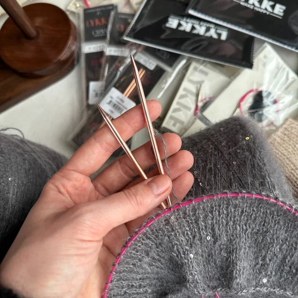 Номер каждой спицы выбит на патроне, поэтому он не сотрется при эксплуатации. Спицы имеют плавное соединение с леской, вязание идет быстро и легко. Леска не крутится в отверстии спицы, она зафиксирована. Съемные спицы LYKKE Cypra доступны в размерах от 3,25 мм до 9 мм.