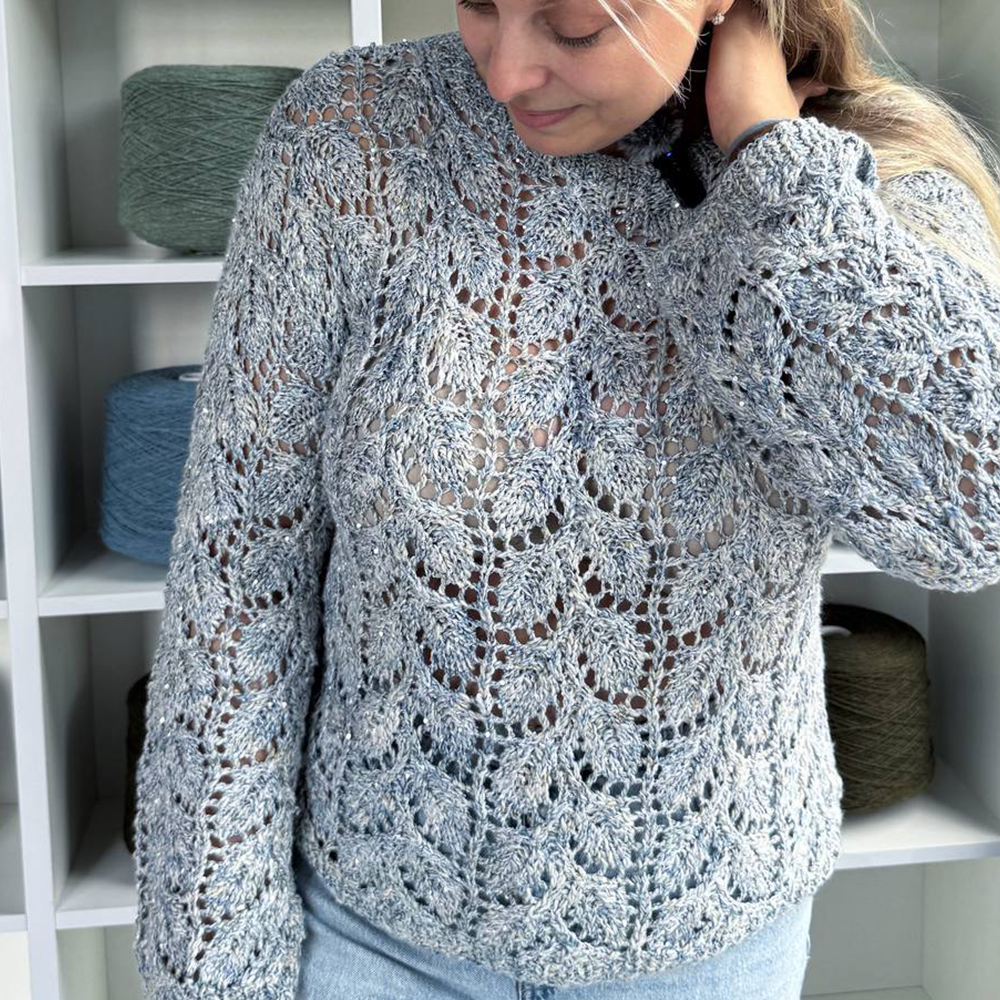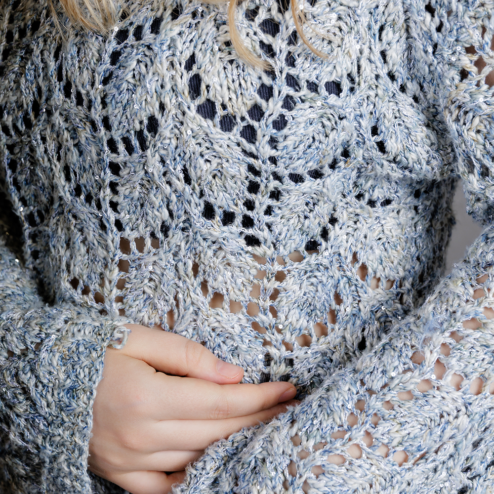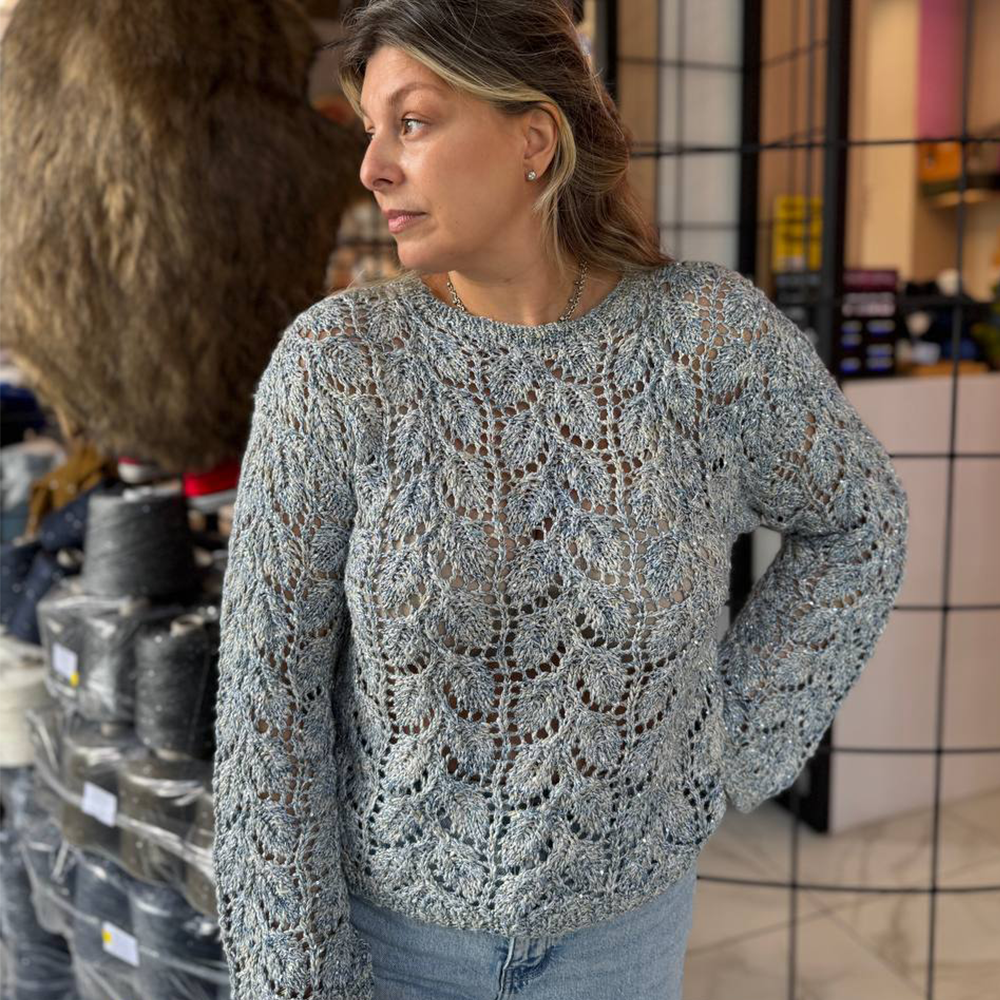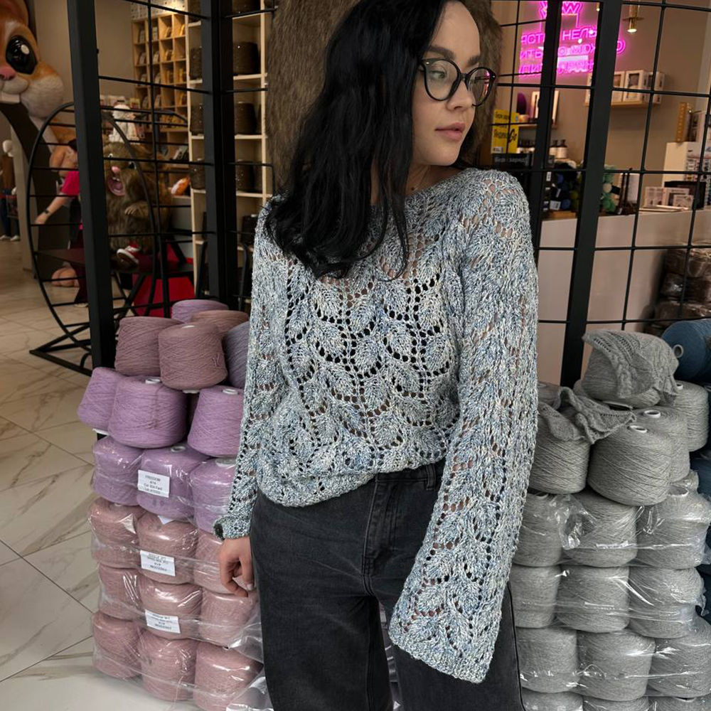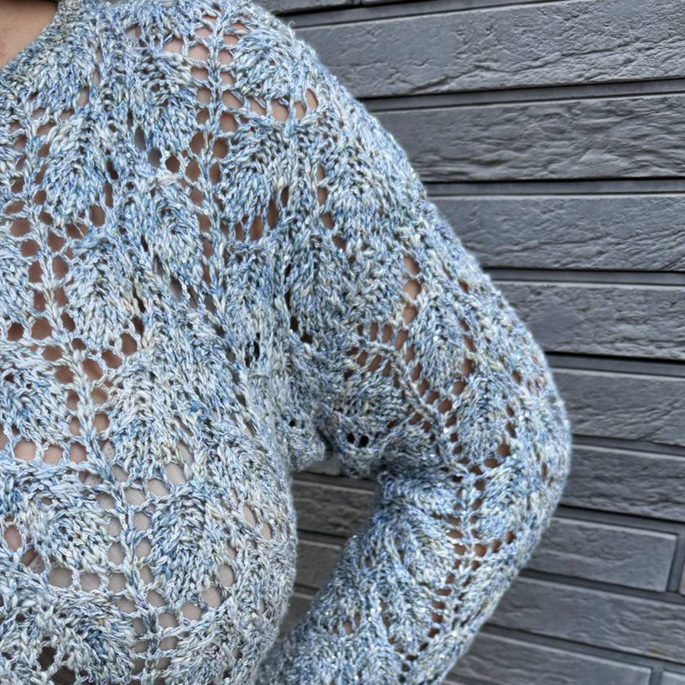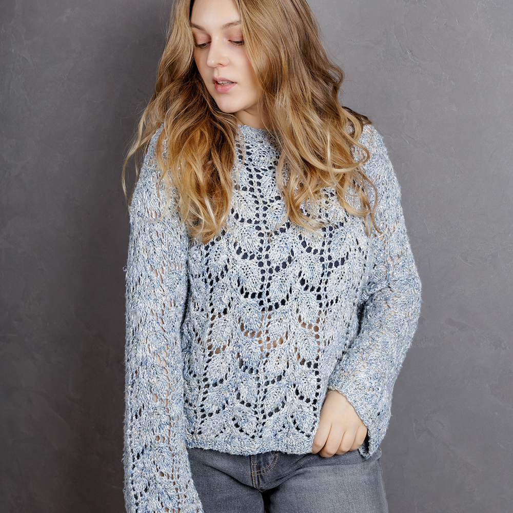 Предлагаем вам связать джемпер популярным узором «Листья» в сочетании с интересной фактурой нити и нежными цветовыми сочетаниями. Изделие выполняется нитью в 3 сложения: 2 нити пряжи Katia Polynesia, 1 нить пряжа Lang Paillettes пайетки.
