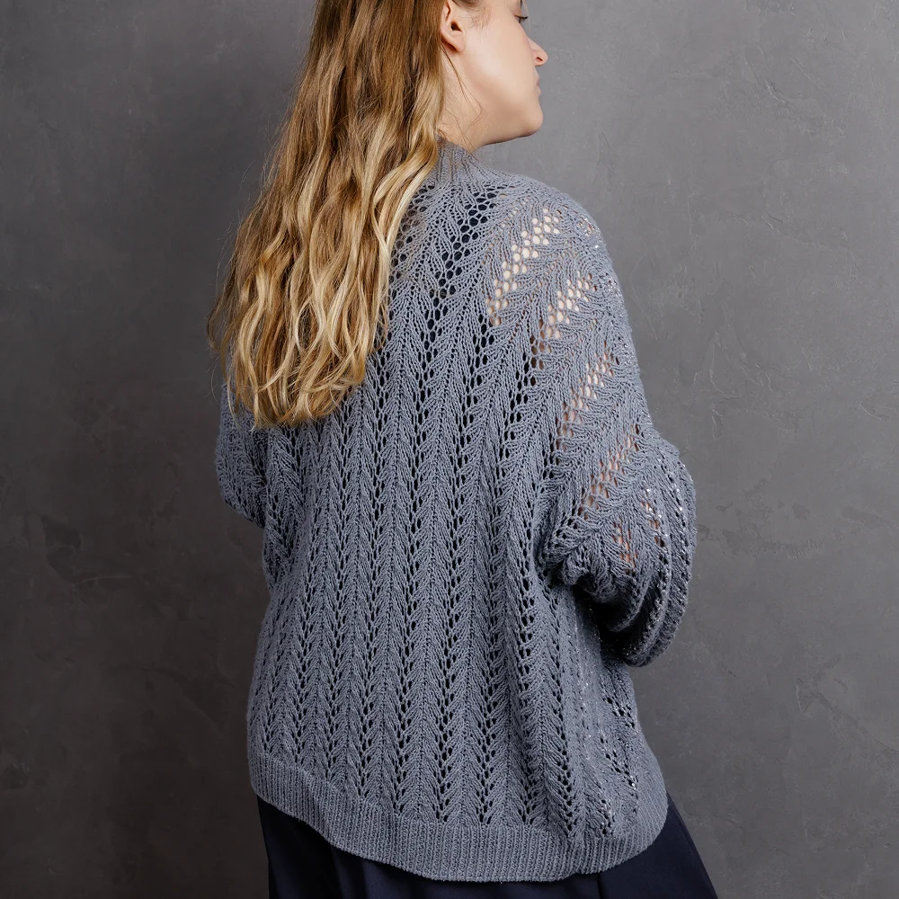 При желании вязать кардиган с добавлением нити с пайетками (при выборе в качестве материала Setalino или Bourette Royalsilk), ее можно добавить к основной нити при вязании всего основного полотна или ввязать пайетки только в вертикальные линии. Видеоинструкция такого способа вязания приведена в описании.