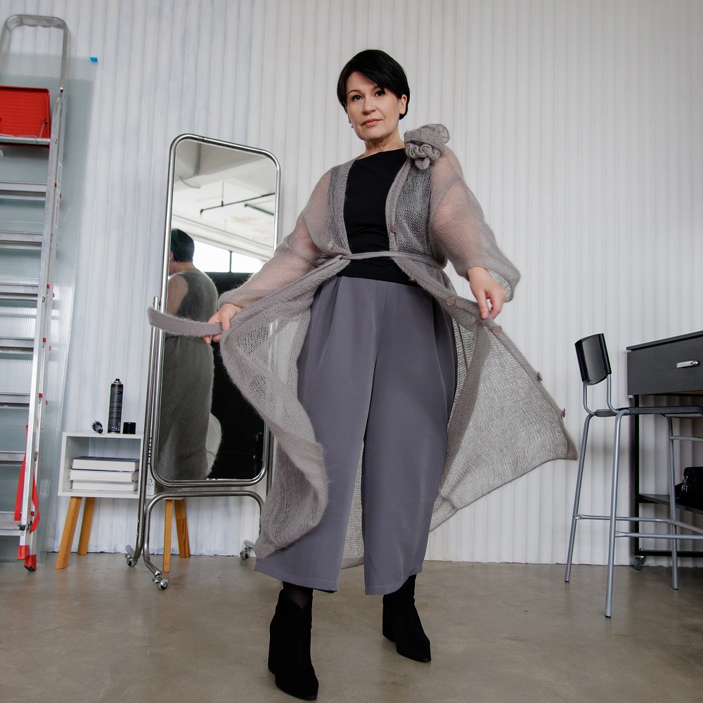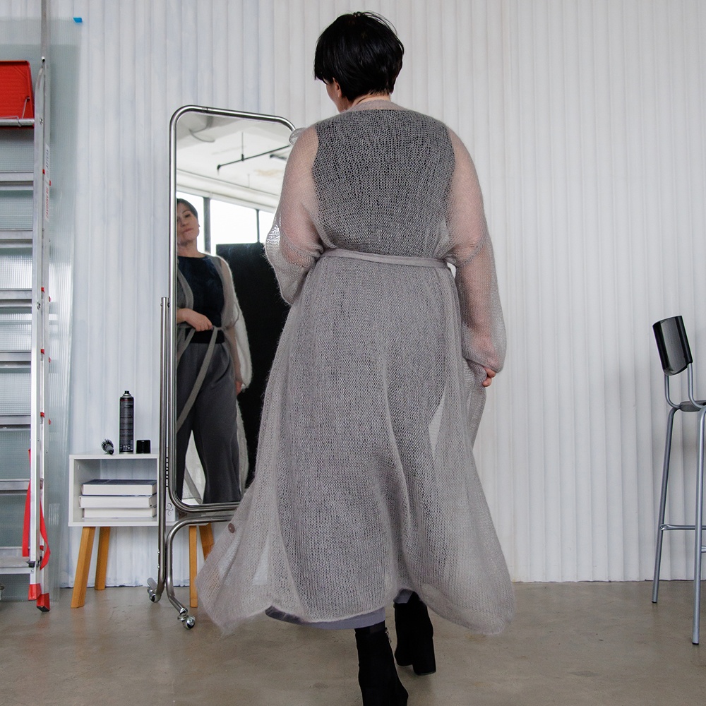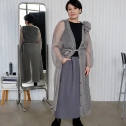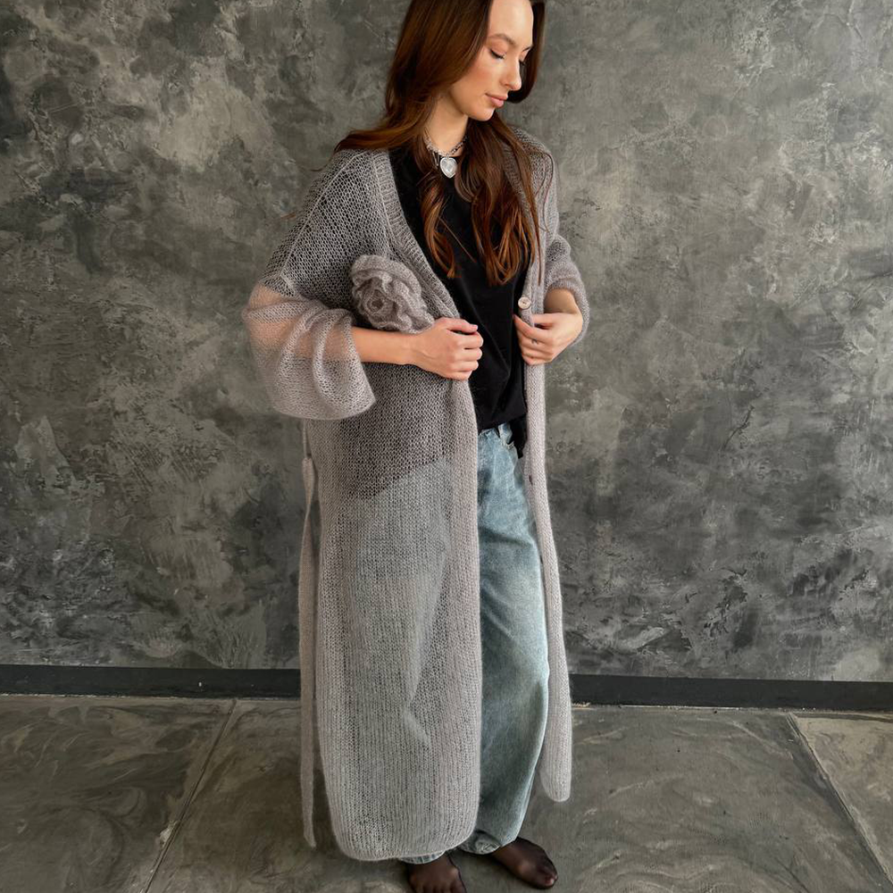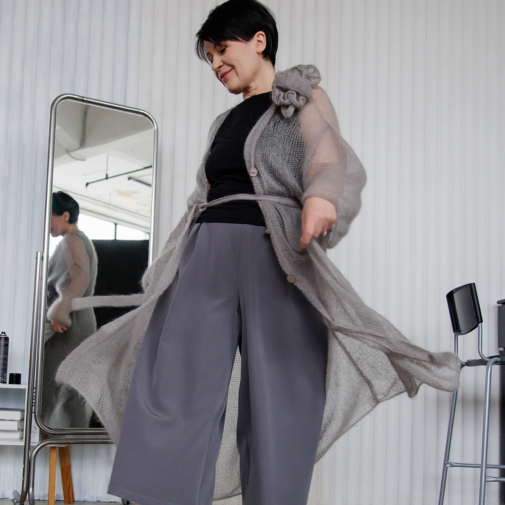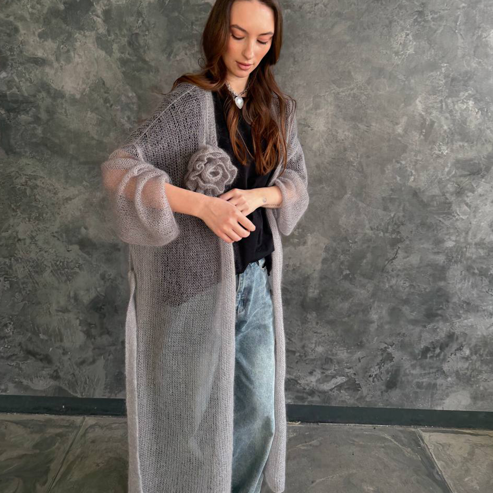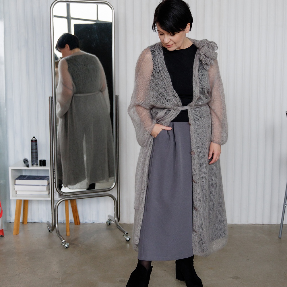 ‑ Длинный пояс как завершение лаконичного оформления кардигана.