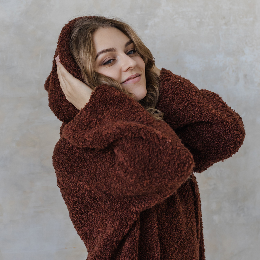 - Букле Millefilli Kookoo (30% меринос, 30% тенсель, 40% ПА, 350 м/100 г) - в две нити - 900/950/1000/1100 г (в соответствии с размером).