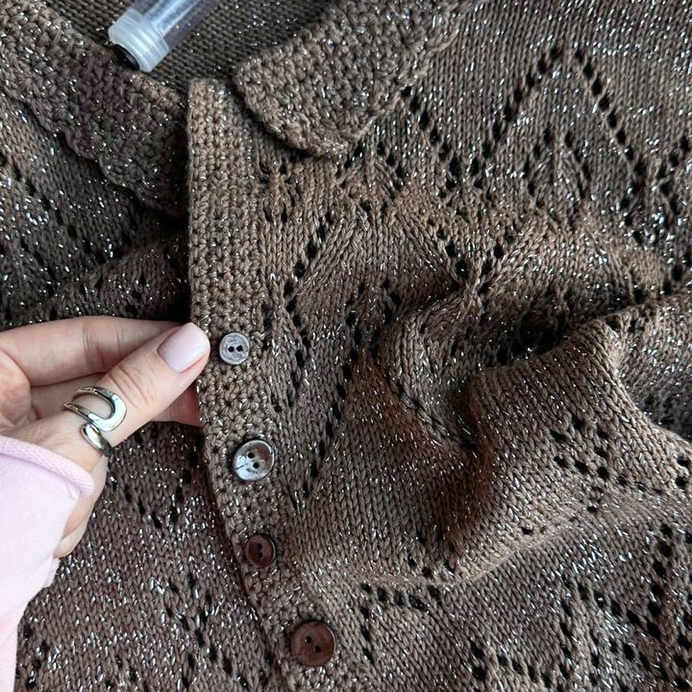 Рубашка связана в двух техниках: спицами и крючком. Основное полотно выполнено спицами отдельными деталями, а планки и воротничок аккуратно оформлены крючком, что добавляет изделию утончённости и премиальности. Свободный крой с мягким oversize силуэтом создаёт ощущение лёгкости и свободы. Рубашка не сковывает движения и красиво садится на любую фигуру.