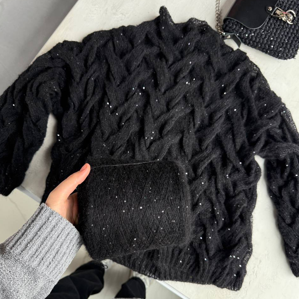 - Бобина Pailettes KidMohair by WoolDom 850 м/100 г (67% кидмохер, 28% шелк малбери, 5% пайетки) – 200/250/300 г