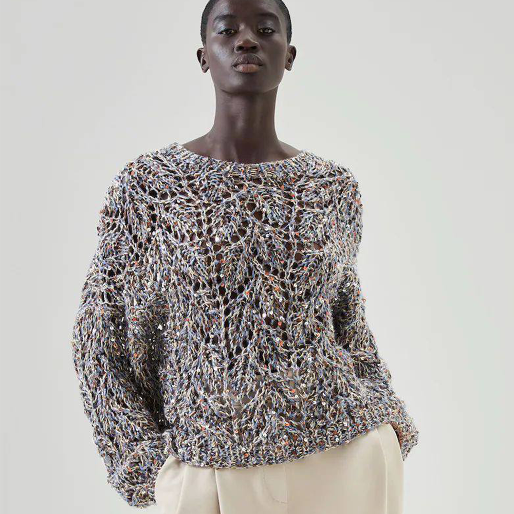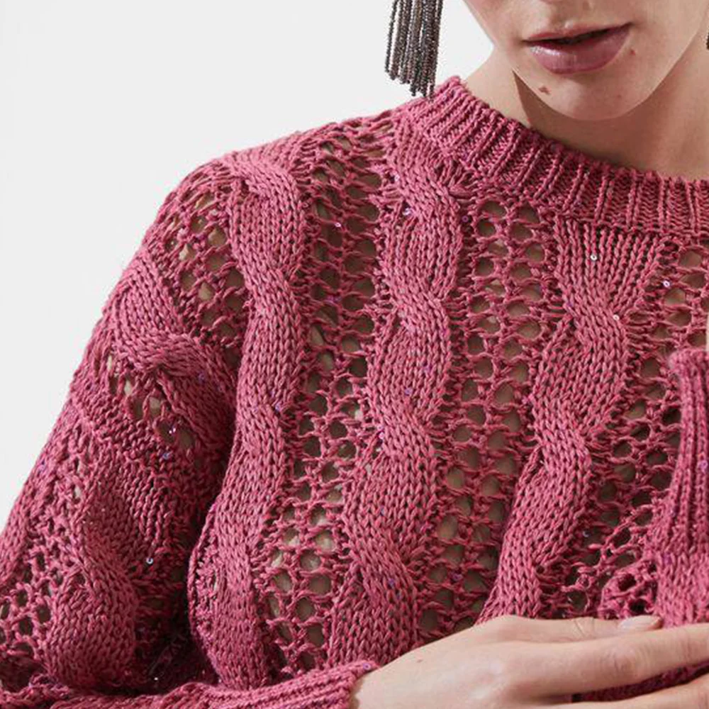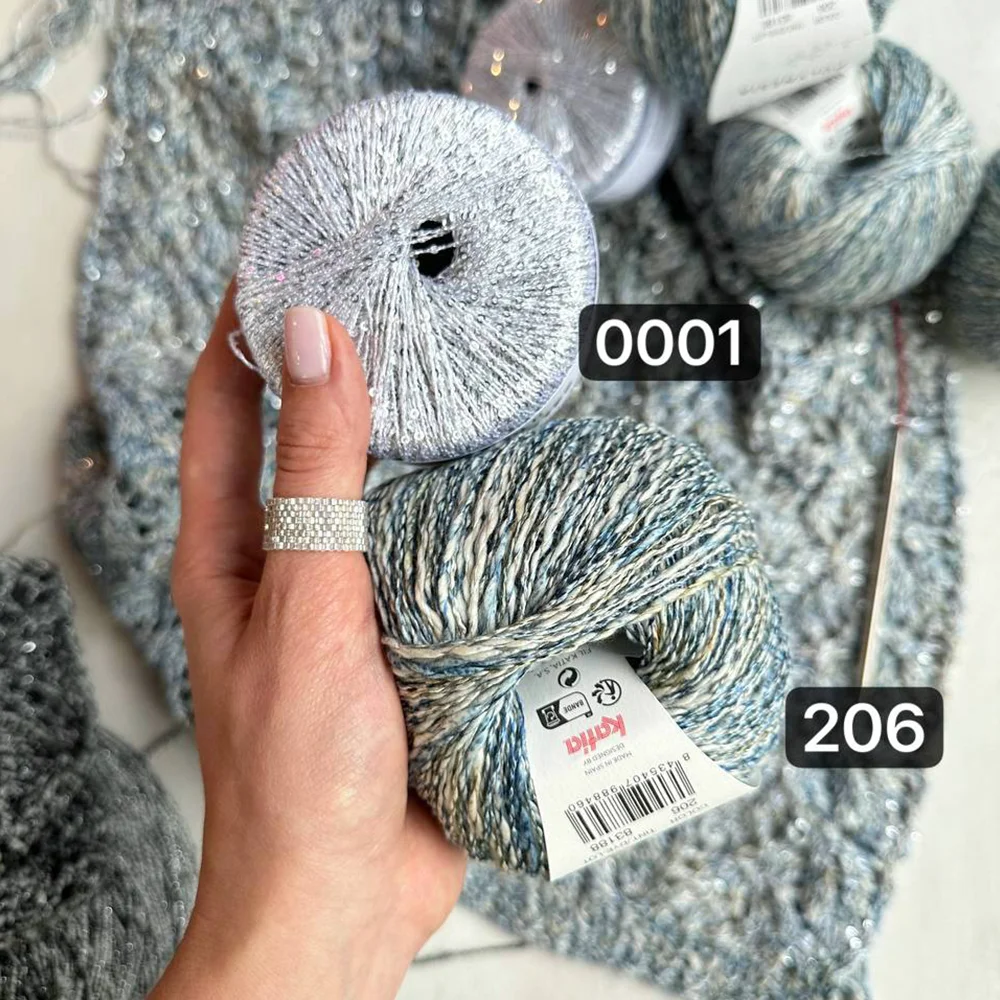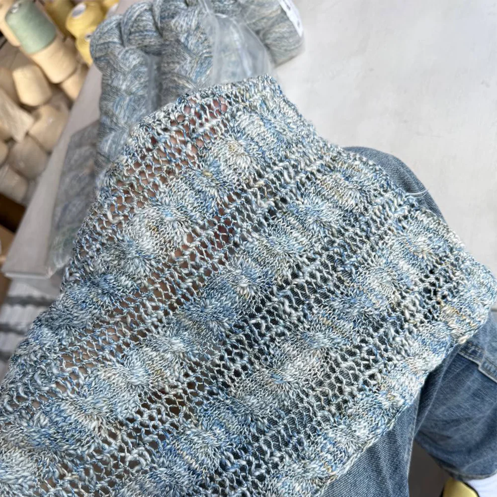 Благодаря матовому хлопку с утолщениями, распределенными равномерно, и витой блестящей нити конопли, создается приятная и интересная фактура. Превосходно будет смотреться в ажурных рисунках, в полотне будет напоминать гипюр.