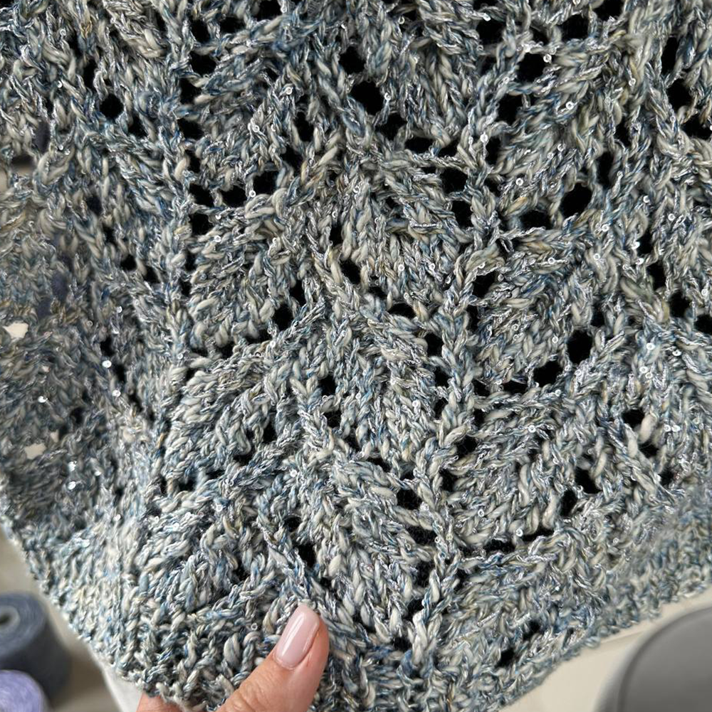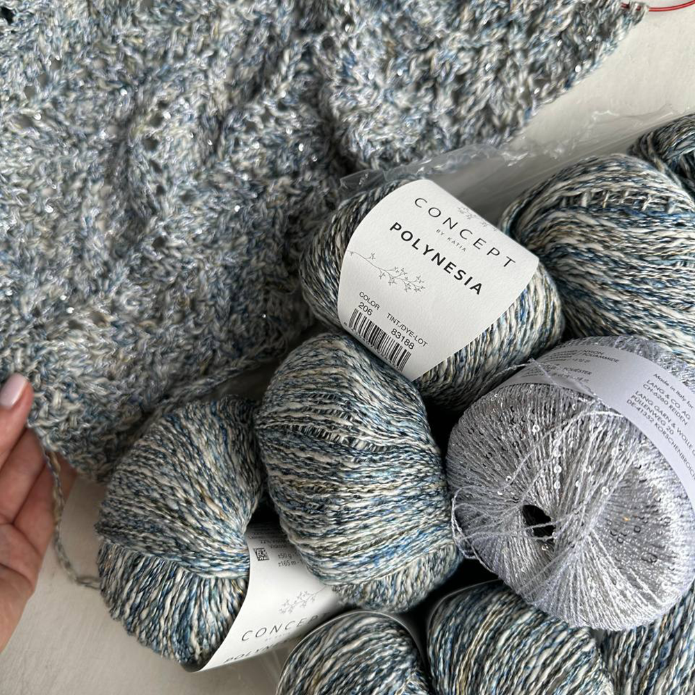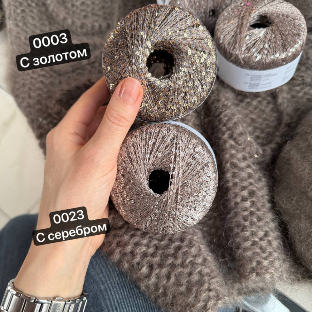 Пайетки маленького диаметра размещены на протяжении всей плотной, но тоненькой полиэстеровой нити достаточно густо, что дает им возможность равномерно распределяться в полотне, не оставляя пустот. К тому же, эту пряжу вязать удобно и приятно. Ее плотность зависит от плотности пряжи, с которой она комбинируется.