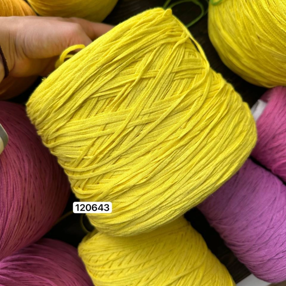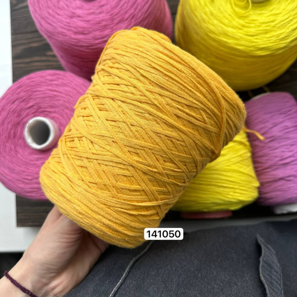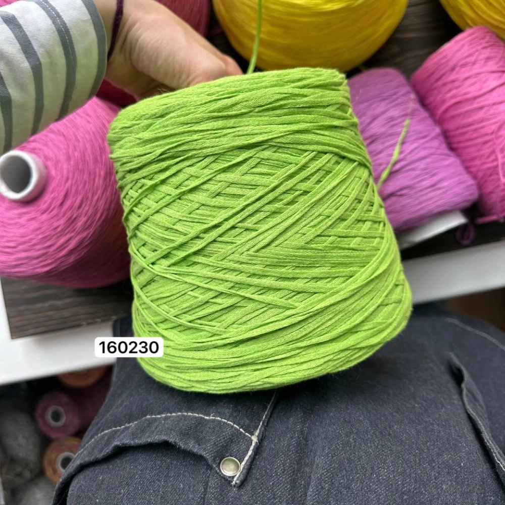 Легкий ленточный хлопок, особого плетения, с мягкими петлями. За счет этого нить-лента не сухая, ласковая на спицах, а в полотне дает хорошие драпировки, мягкие волны без заломов. Изделия не мнутся в носке, легкие и быстро сохнут.