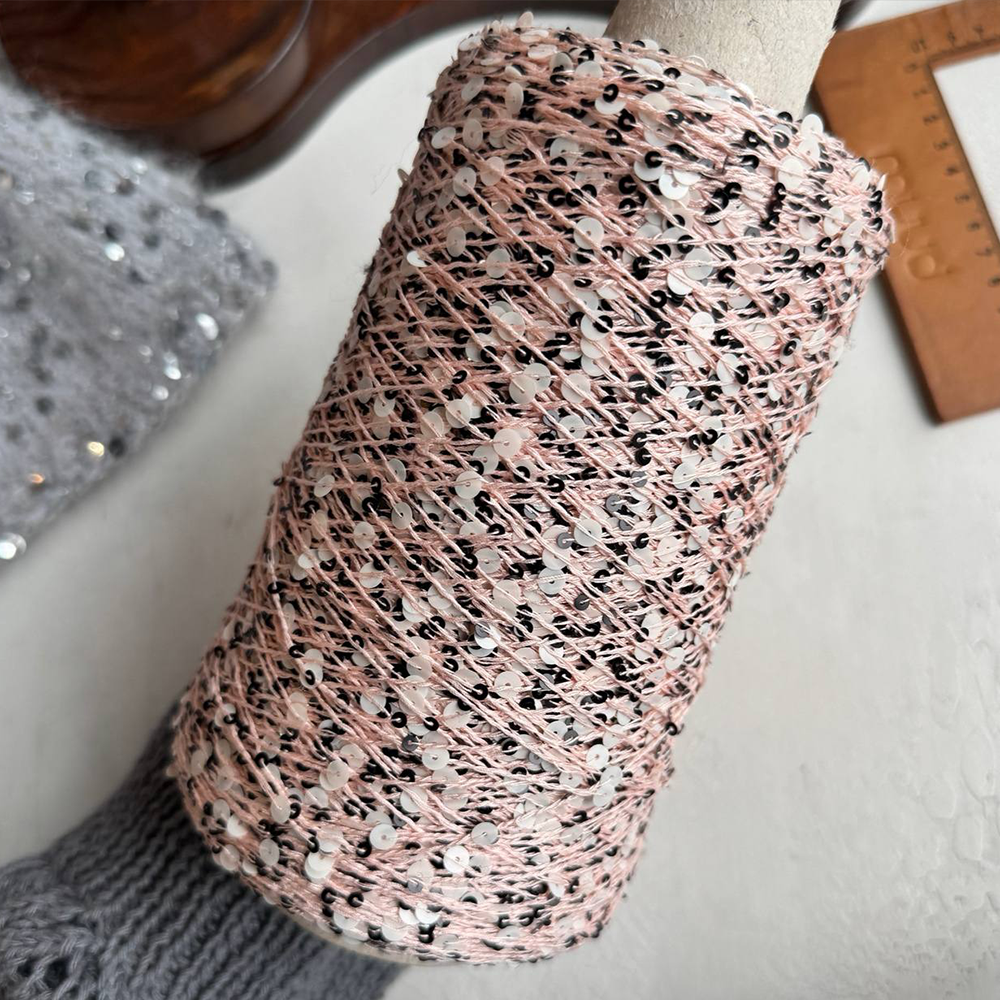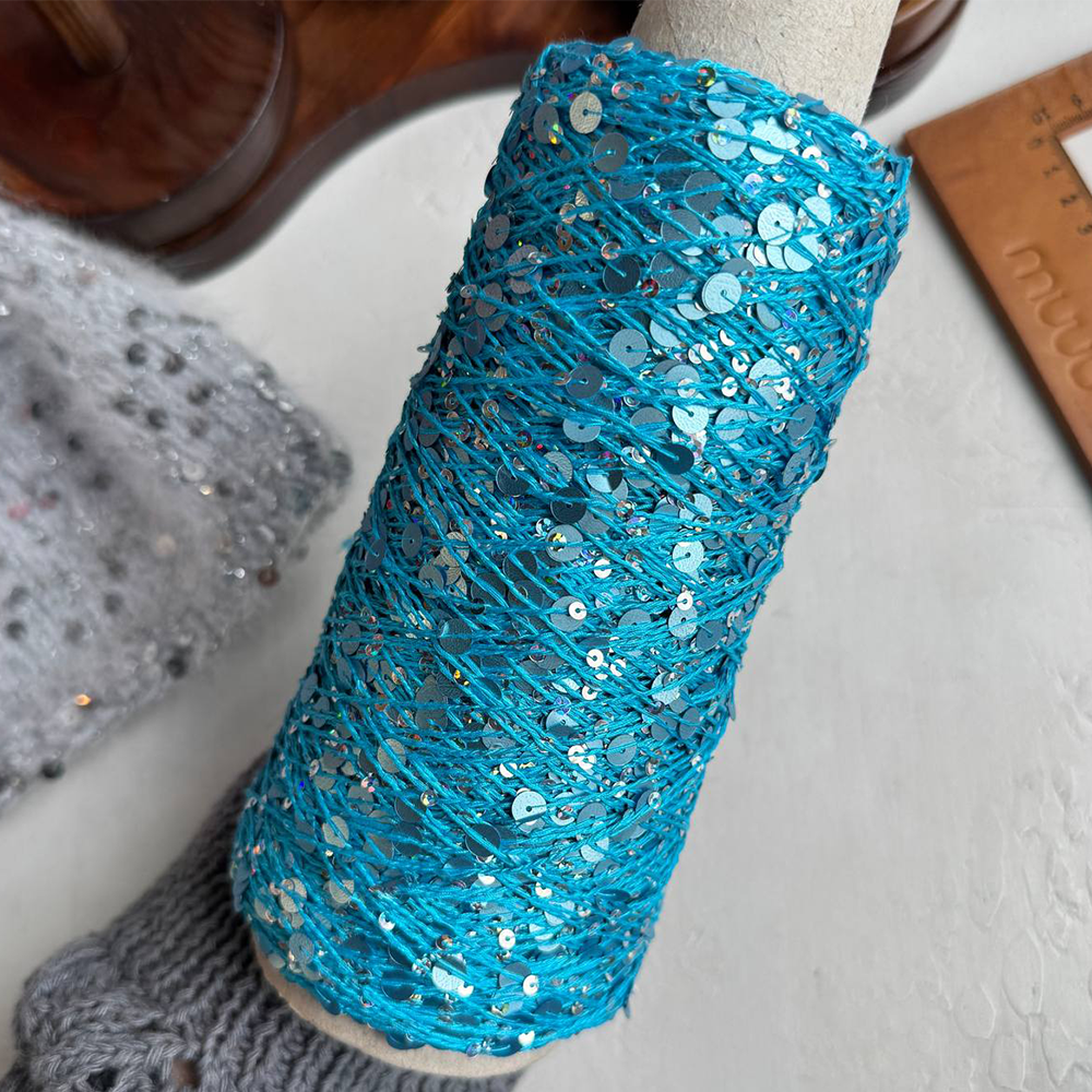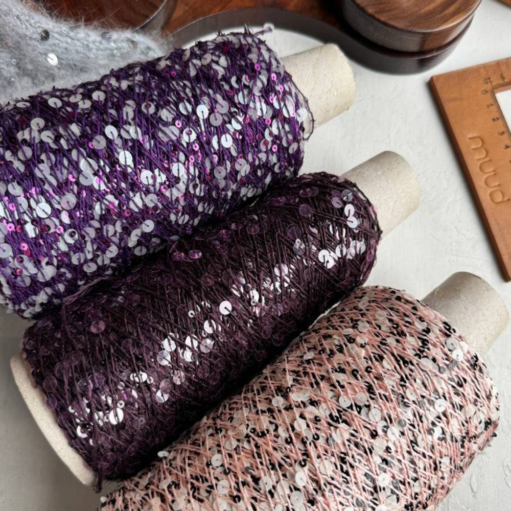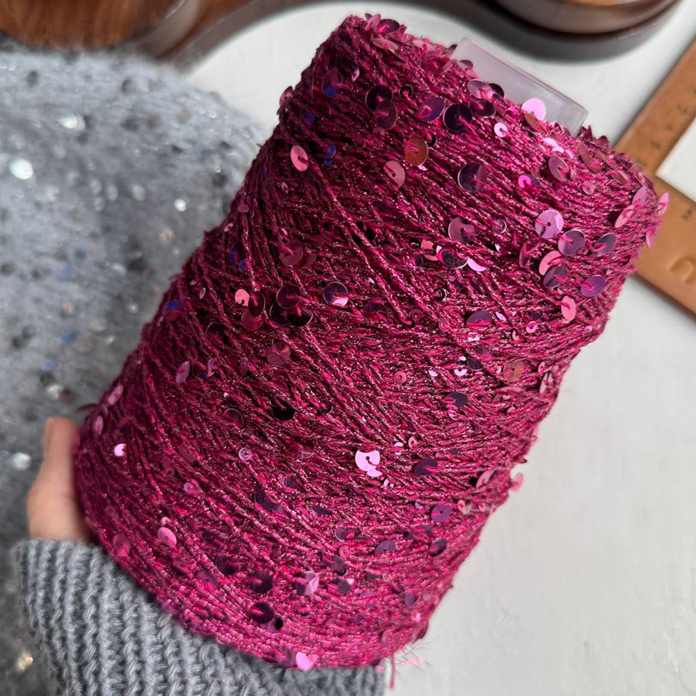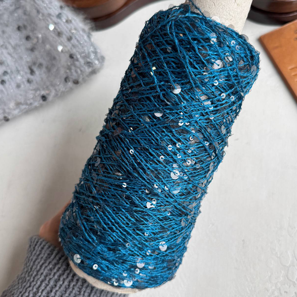 Обратите внимание на то как расположены пайетки и на чередование их размера. Диаметр 3 мм и 6 мм, они чередуются в определенной последовательности, что и создает этот незабываемый эффект мерцания, словно пряжа заигрывает с вами.