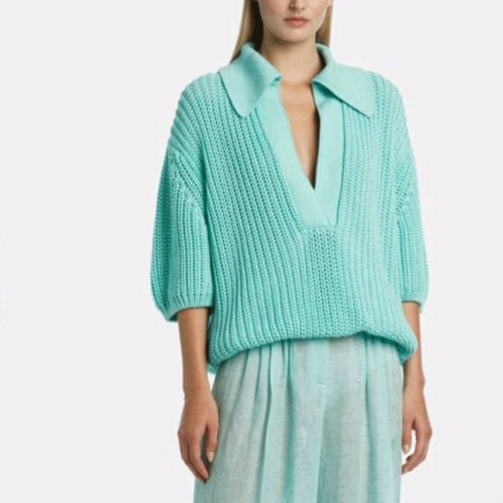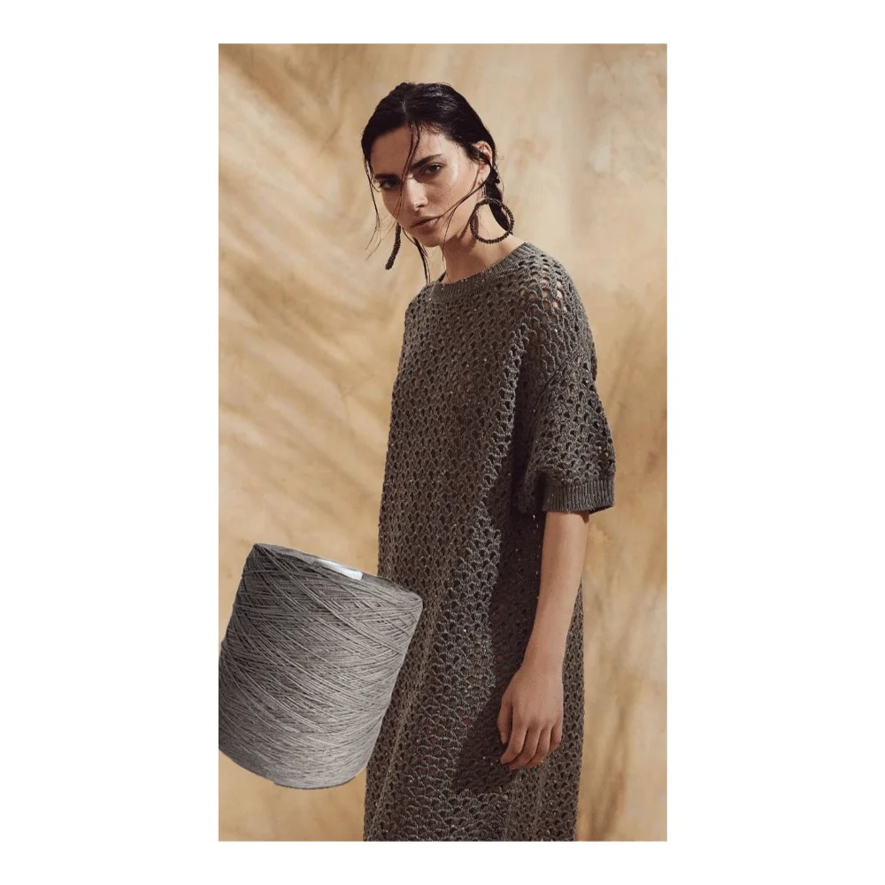 Лен охлаждает кожу, хорошо впитывает влагу и обладает антибактериальным эффектом. Вяжите из Cotolino тонкие и летящие футболки, туники, джемперы, костюмы и платья. В качестве сияющего фактурного подмота горячо рекомендуем Cristallo.