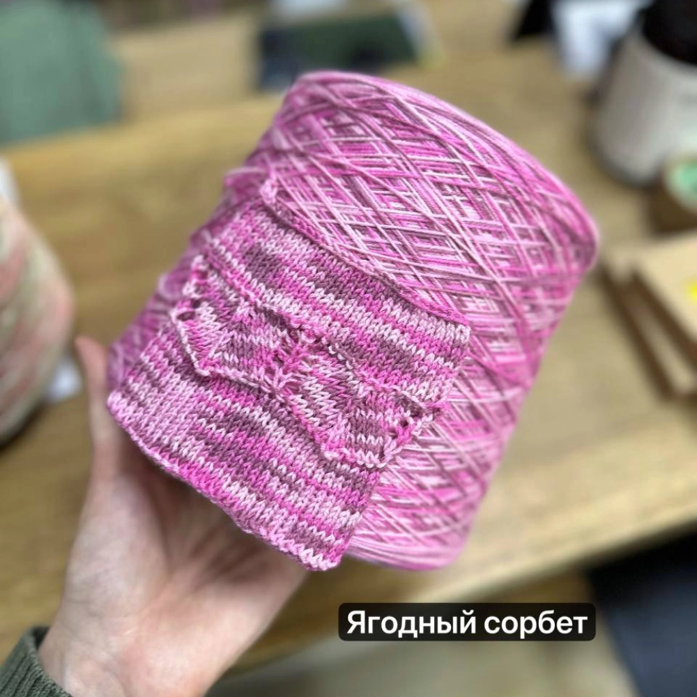 Окрашено специально для ДомПряжи. Короткие секции ложатся в полотно с мягкими переходами, не требуя подгона рисунка. Метраж — 600 м на 100 г, вяжите в одну нить на спицах 2-3 мм.