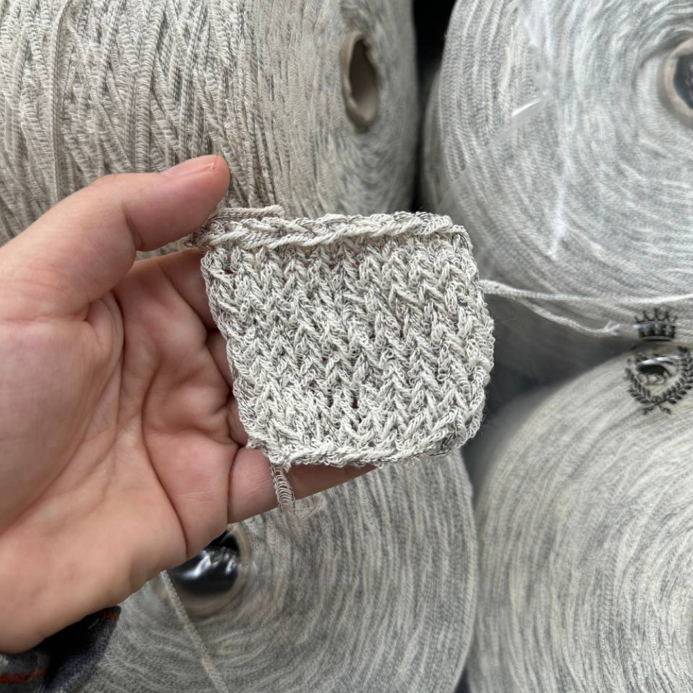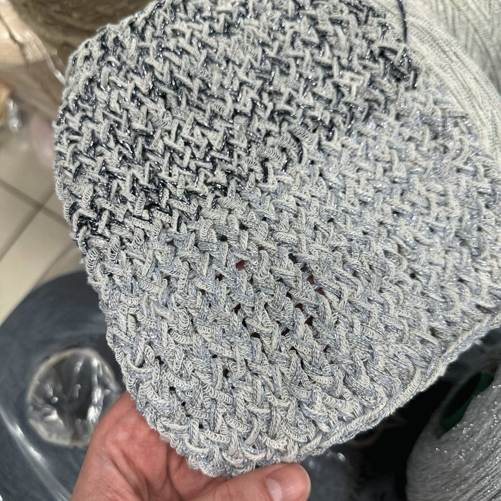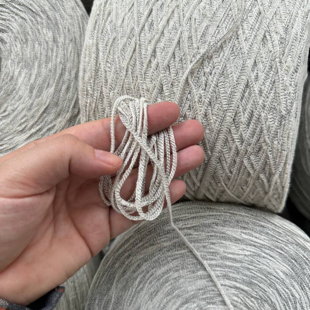 Dorimello — необычайно тактильная нить с кружевной структурой. Хлопковая нить снует между прочными нитями основы и создает эффект кружева.