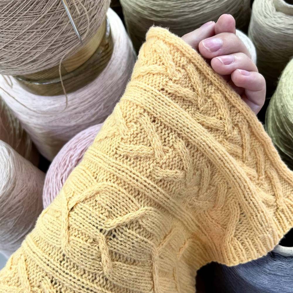Пряжа матовая, имеет бархатистый пушок около 2 мм, хорошо держит рельеф в аранах и теневые рисунки. При плотном вязании держит резинку, при среднем – резинка рельефная, но не упругая. Подходит для вязания изделий, где необходимо минимизировать деформацию.