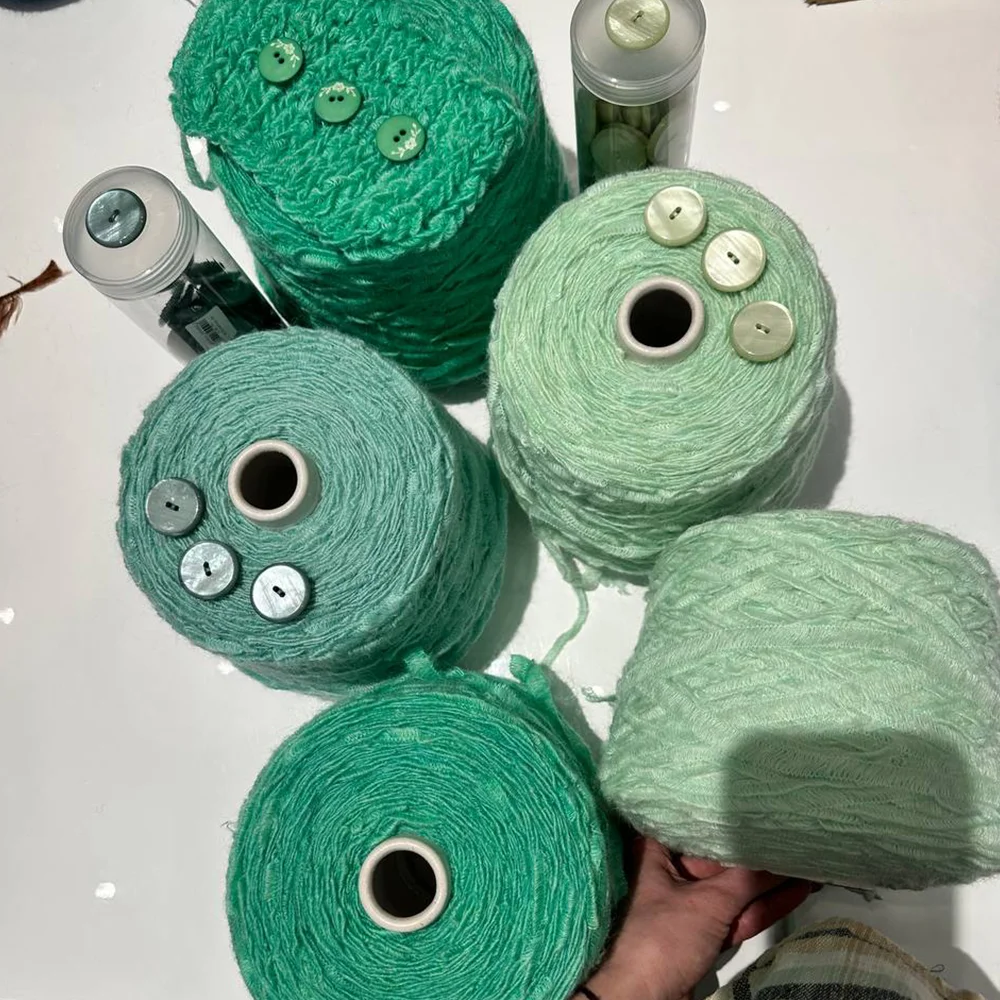 Tulle — это вспушенный кидмохер с фактурой вуали, собранный на стабилизирующую нейлоновую нить. Аналогичная пряжа используется в коллекциях люксовых брендов, включая Loro Piana.
