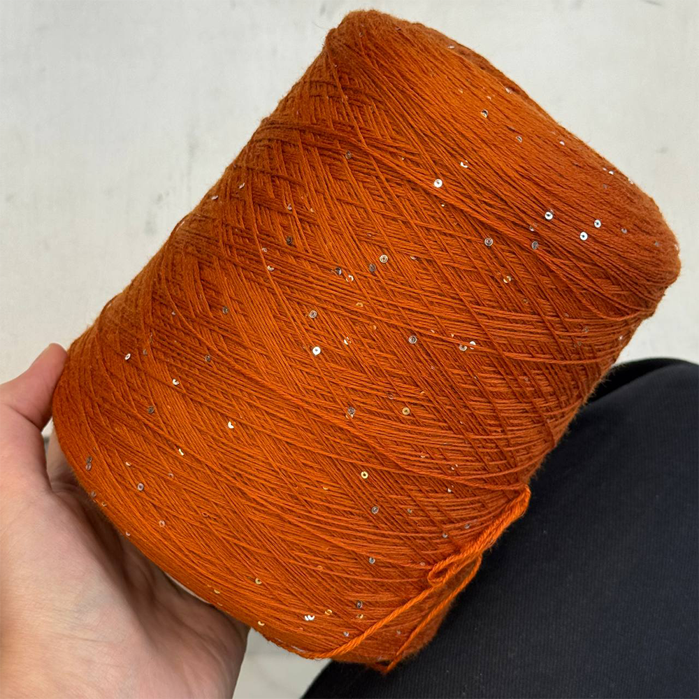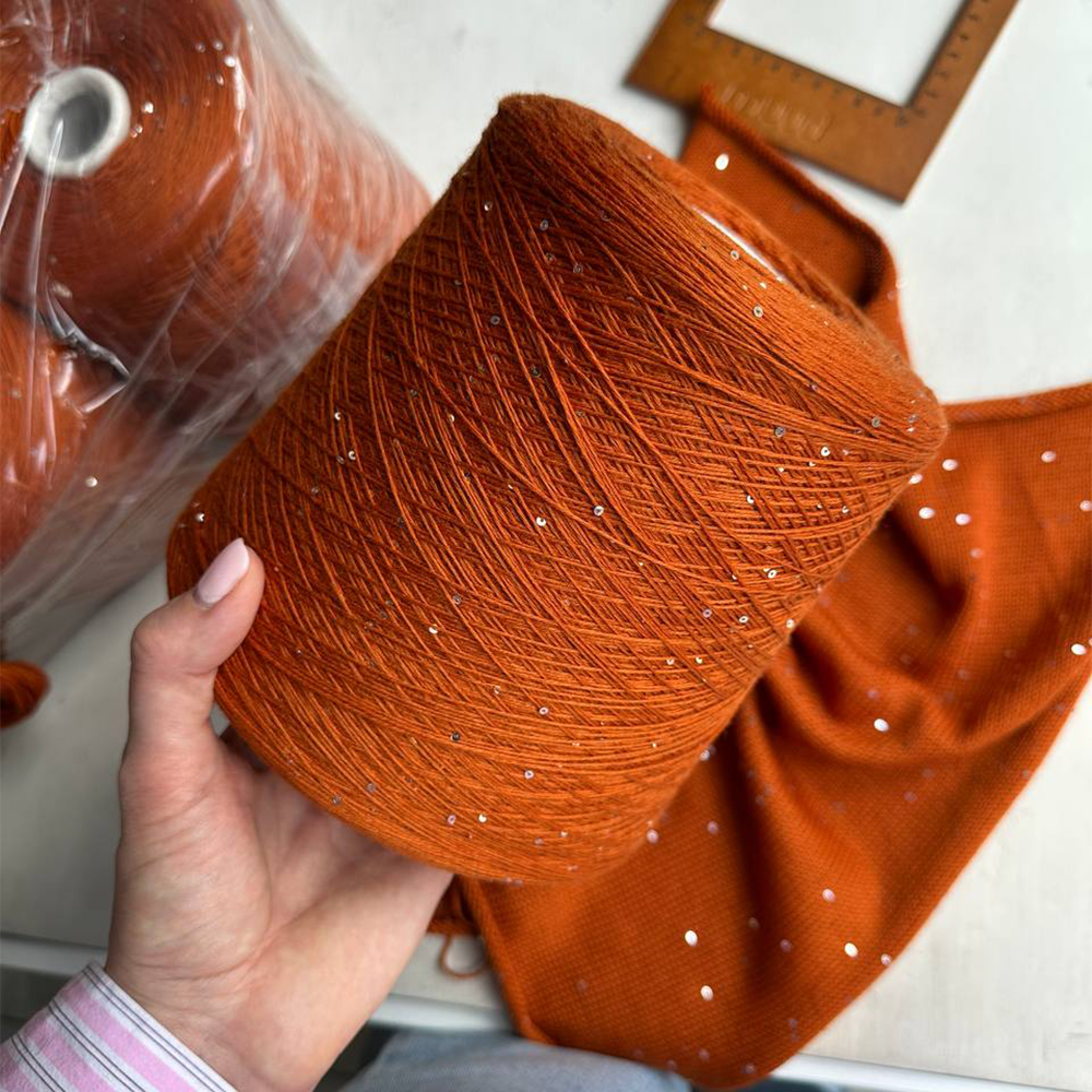 Нить упругая и шелковистая, петли сами ложатся на спицы. Несмотря на натуральный состав, эта пряжа неубиваемая: переживает многократную машинную стирку, не пушится, не пилингуется, не колется. Нить нетолстая, 600 м на 100 г, можно вязать в два сложения на спицах 3-4 мм — так и пайеток будет в два раза больше, также идеально подойдет для машины 5ого класса.