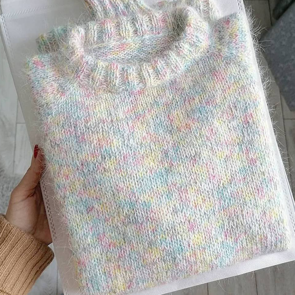 Перед работой обязательно свяжите большой информативный образец, постирайте его 2 – 3 раза и только после этого приступайте к расчётам. Для Bellini не нужны сложные узоры или крой, вяжите её лицевой или изнаночной гладью, резинка с широким шагом тоже подойдет в качестве рисунка, модели выбирайте свободные, немного овер, в стилях Casual или Grunge.