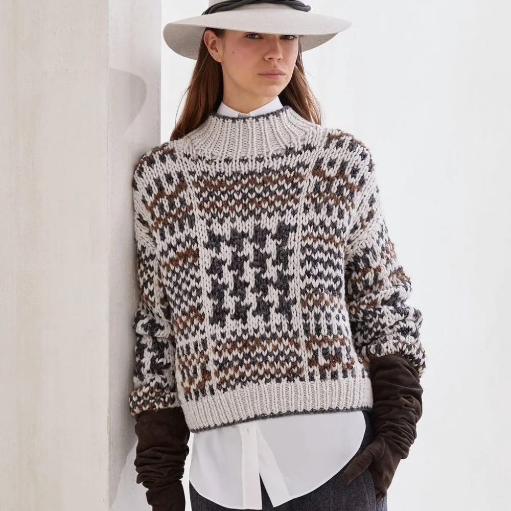 Жаккардовые узоры в образах – ключевой тренд во все времена. Это четкий дизайн, плотность и универсальность в создании вязаных изделий. Современная мода делает упор на геометрические мотивы и использование жаккарда в качестве акцентного элемента. Предлагаем связать популярную модель Кучинелли с эфектным орнаментом.